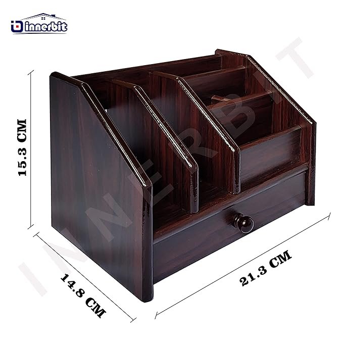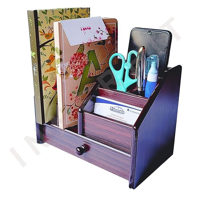 6 in 1 Wooden Pen Stand with Drawer, Visiting Card, Mobile, Remote Control Holder, Book Diary Shelf Multipurpose Desk Organizer for Home, Office & Study Table, Stationery Corporate Gift
