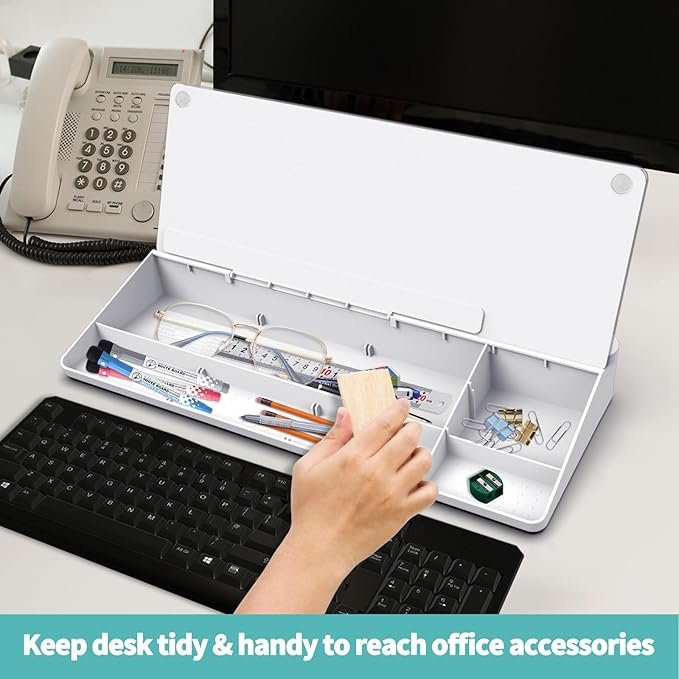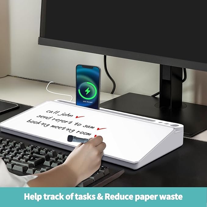 - 【Multi-Storage & Organization】Features a hidden compartment, detachable spacer, pen tray, card slot, device slot, and cable hole, easy to store office supplies and gadgets neatly, convenient to hold device even when charging. Our desk whiteboard organizer can sweep away the desk clutter