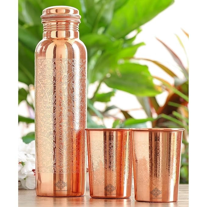 - Crafted from pure copper, this drinkware gift set features a stunning embossed design, exuding elegance and traditional charm. The set includes a 600 ML copper bottle and two 300 ML glasses, making it perfect for daily use and special occasions.