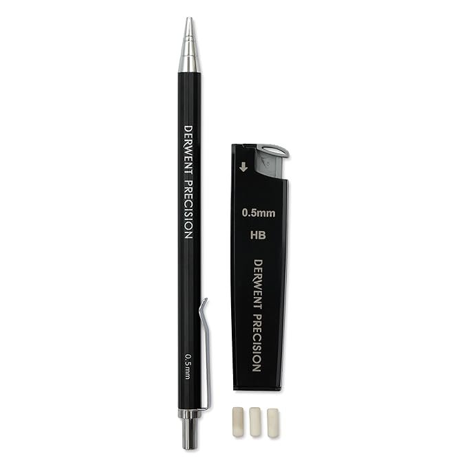 • Contents: 1x Derwent 0.5mm Precision Mechanical Pencil, Includes 15x 0.5mm HB leads and 3x erasers, Dimensions (DxHxW): 1 x 23.5 x 9.5, Weight: 40 g , Black