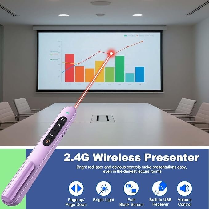 - [Presentation Clicker with Red Light Pointer] The clicker for powerpoint presentations boasts RF 2.4ghz wireless remote control without interference from others and can work well within as far as 328 ft (100m). The pointer for presentations is so bright and steady to see clearly on any screens (not recommended for LED, LCD).