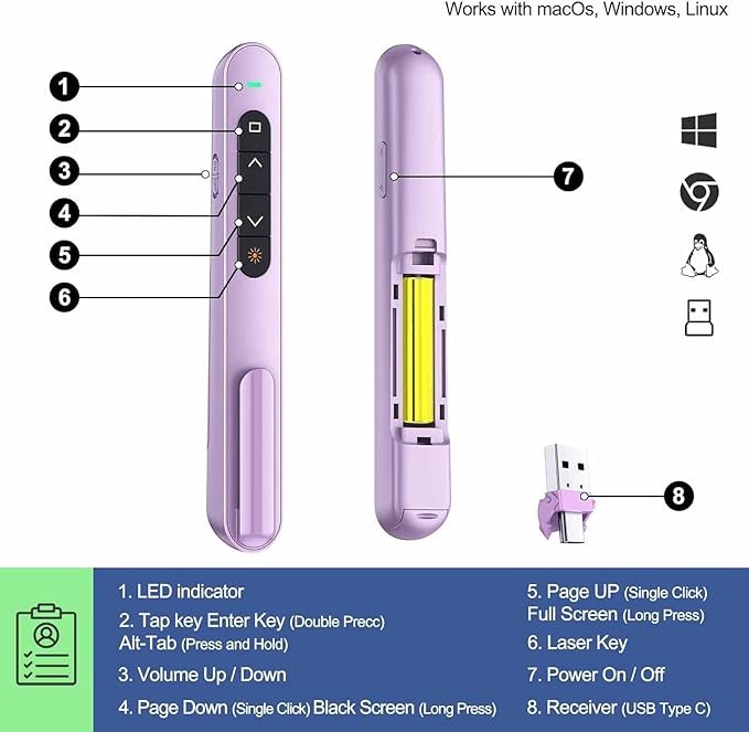 - ✅2 Year Warranty【Plug and Play】[USB A & USB C 2 in 1 Receiver, Plug and Play]【Widely Compatible】 Wireless presenter clicker with laser pointer Perfect works with apple mac, MacBook pro air, desktop laptop computers pc smartboard, projector presentations. Presentation remote supports systems: Windows 2003, XP, Vista, 7, 8, 10, Mac OS, Linux. Wireless presenter remote supports software: Google Slides, MS Word, Excel, Keynote, Prezi, iWork, PowerPoint/PPT, etc. (⛔not recommended for LED, LCD, TV screens⛔)