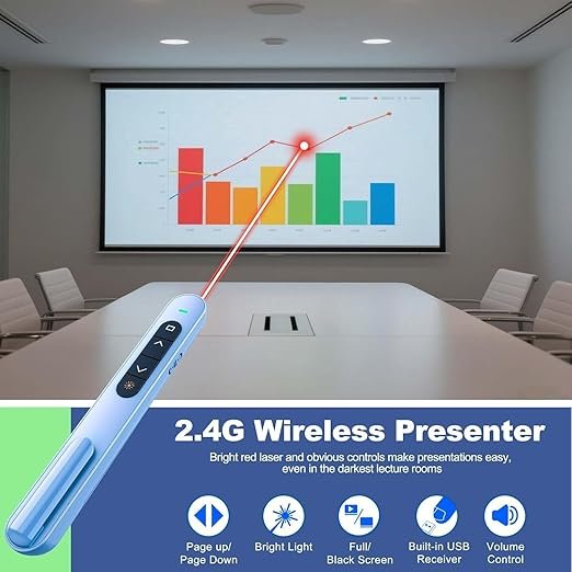 • [Presentation Clicker with Red Light Pointer] The clicker for powerpoint presentations boasts RF 2.4ghz wireless remote control without interference from others and can work well within as far as 328 ft (100m). The pointer for presentations is so bright and steady to see clearly on any screens (not recommended for LED, LCD).
