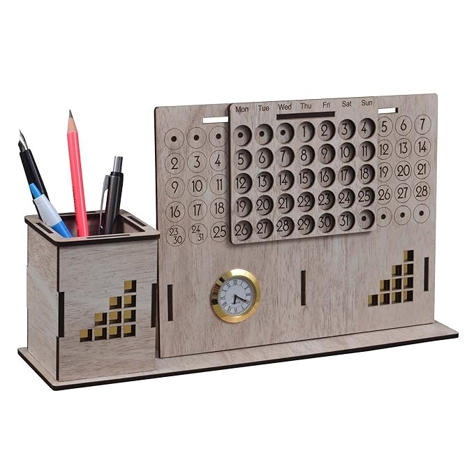 MULTIPURPOSE: This Product Can Be Used As Pen Holder Stand, Lifetime Calander And Time Showing Table Clock.